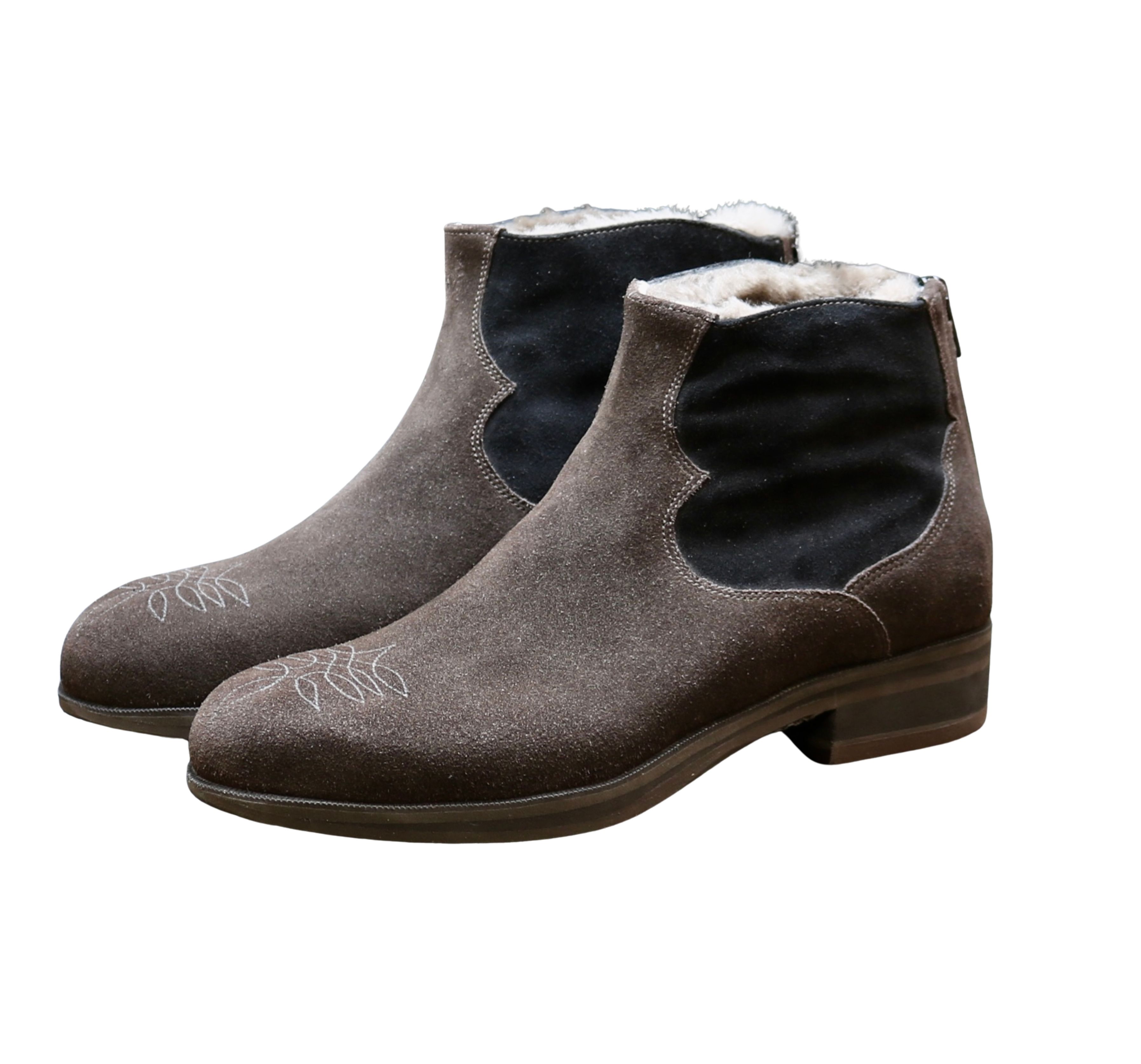One of a kind, delicately handcrafted boots from rich brown whole suede and super silky luxurious black reverse calf. Accented with a beautiful cowboy inspired stitch pattern on the toes. This particular pair have a Zip at the back for ease of entry and is surrounded internally by Slink (soft baby sheep skin lining). The light weight soles and heels are constructed from a selected mix of densities in brown rubber/EVA materials, complimenting the structure and design as a whole. These profiled soles help with the forward motion and the broad smartly shaped heels aid posture and stability. This unique style can be seen through smart, classic, and casual, and will work lovely throughout the later seasons. They are suitable for occasional and every day town and street walking Street.