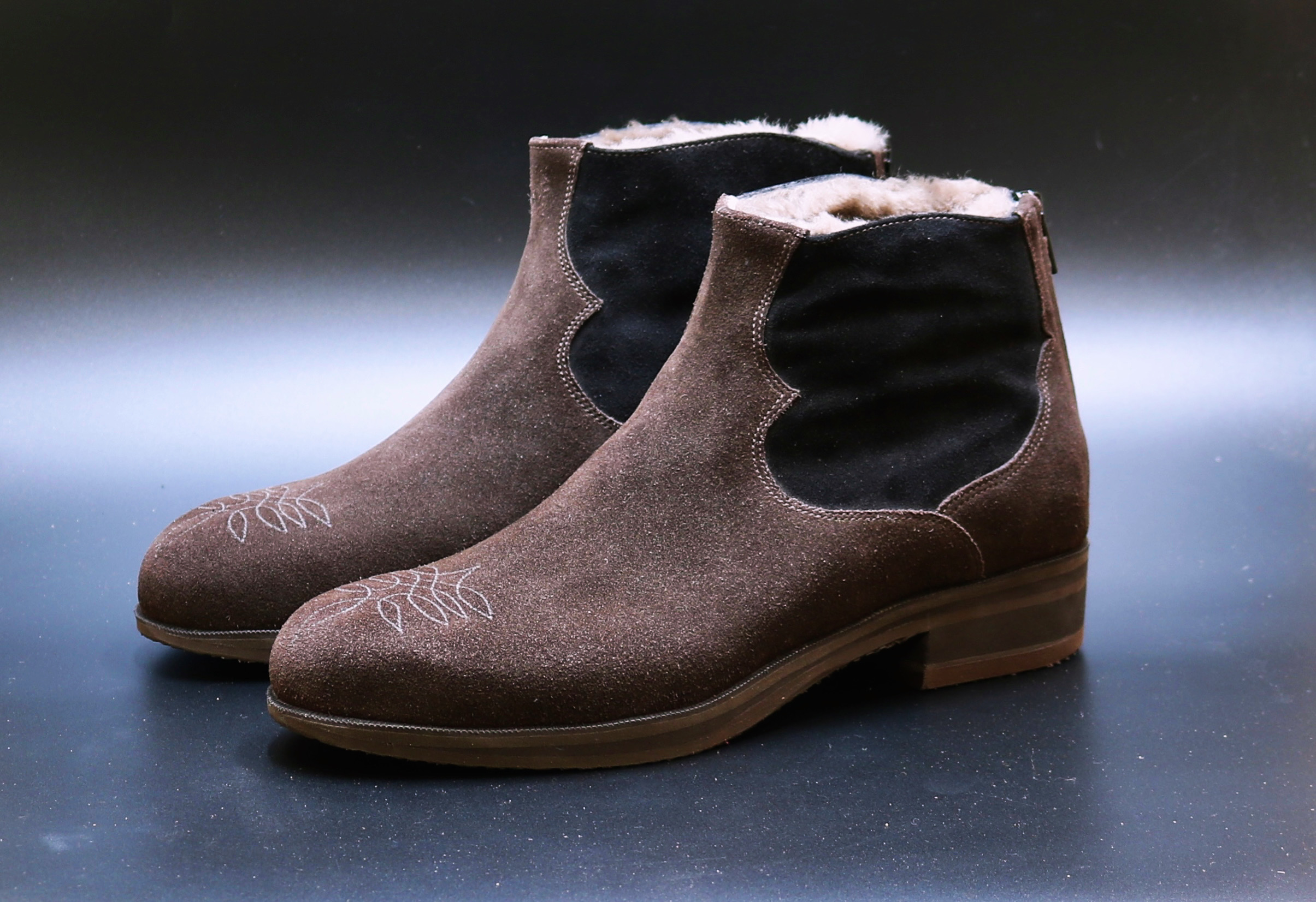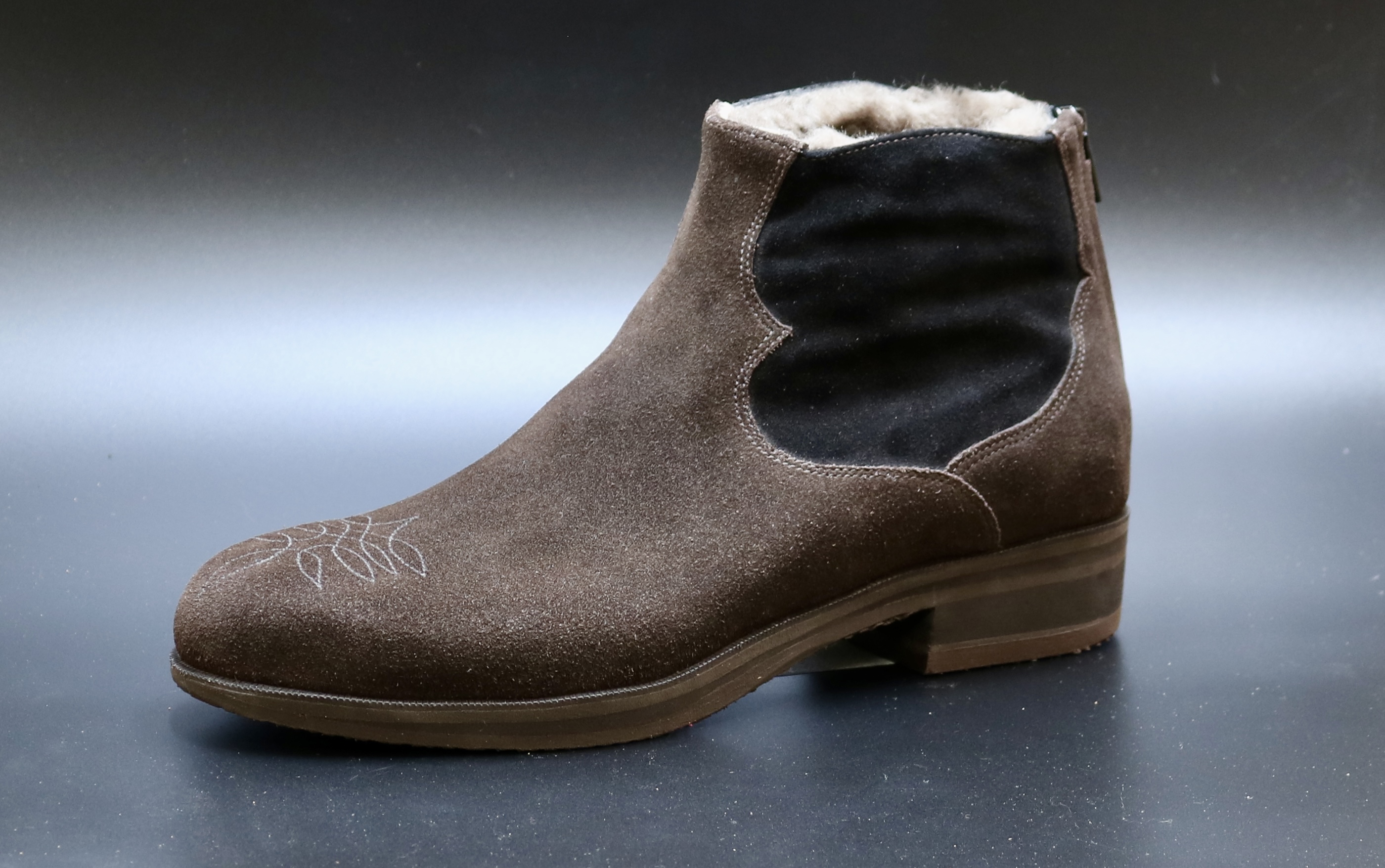 These boots were made for a post surgical RTA foot (Road tra?ic accident). Where two feet can look very different in shape and volume and we aim for symmetry wherever we can. Not only that, the biomechanics may work and perform in di?erent ways due to surgery and the healing process. These specific rehabilitation boots are made with a zip down the back for ease of entry and closure due to restricted foot movements. They are a combination of rich brown whole suede and super silky luxurious black reverse calf. The side panels mimic a classic elastic sided boots but with a flare. Internally they are cushioned and lined with the softest slink skin (baby sheep skin), perfect for feet with neuropathy and skin that is fragile and cold, bringing warmth and comfort around nerve damage. These profile soles help with the forward motion and the broad smartly shaped heels aid posture and stability.The design and toe stitch pattern was inspired by family history and added a personal touch, it was lovely and fun to bring that vision into these boots.
