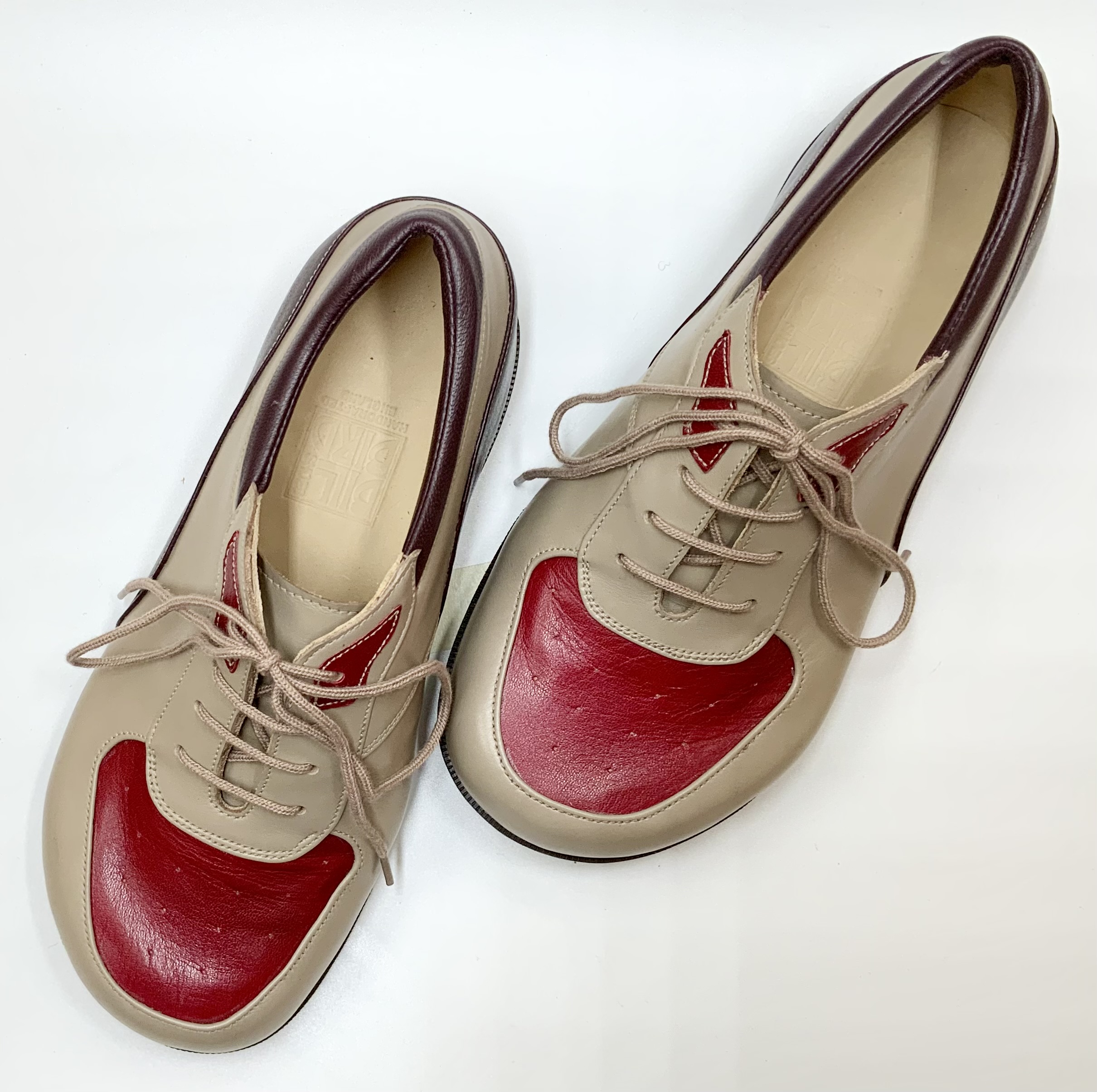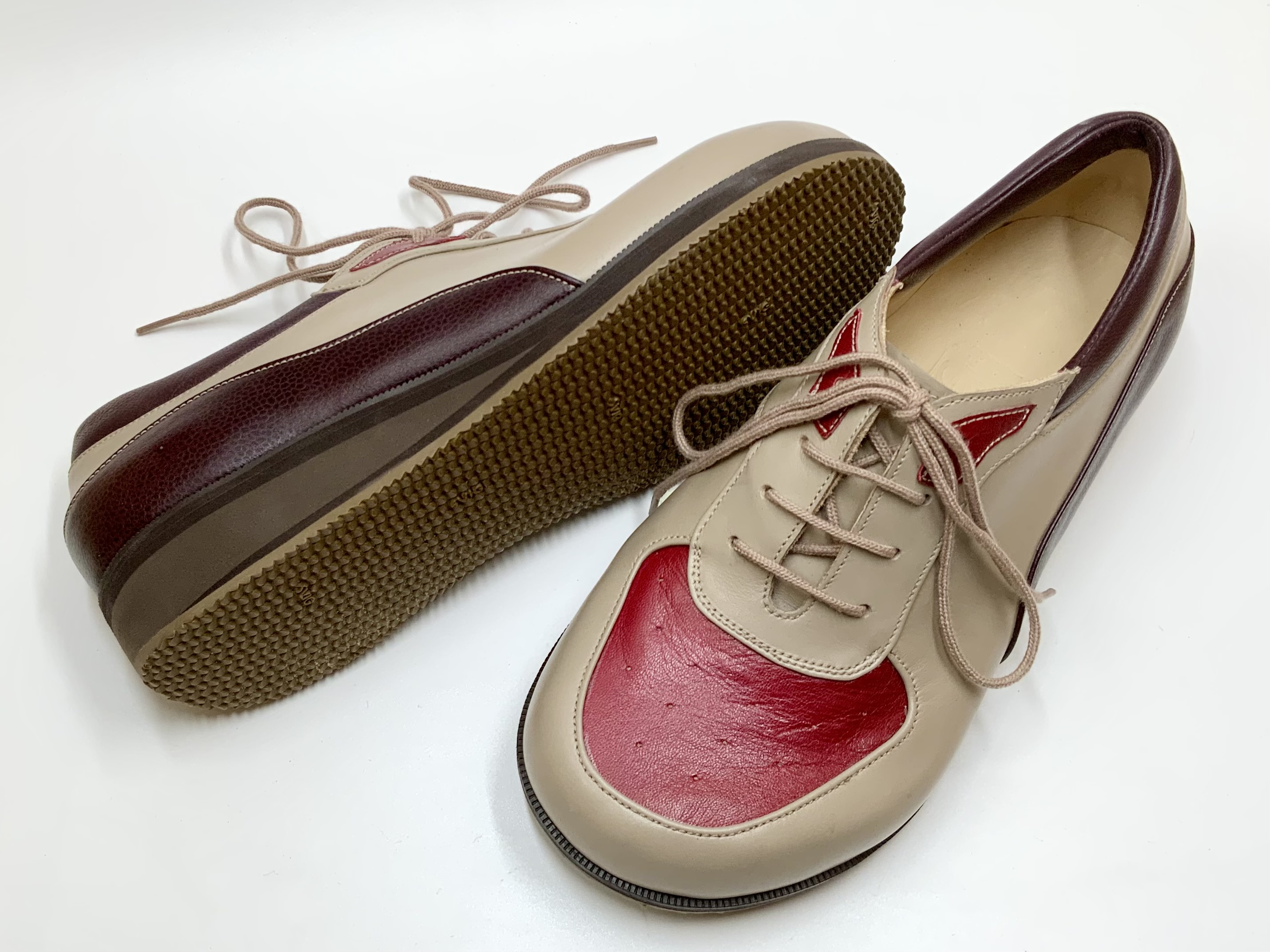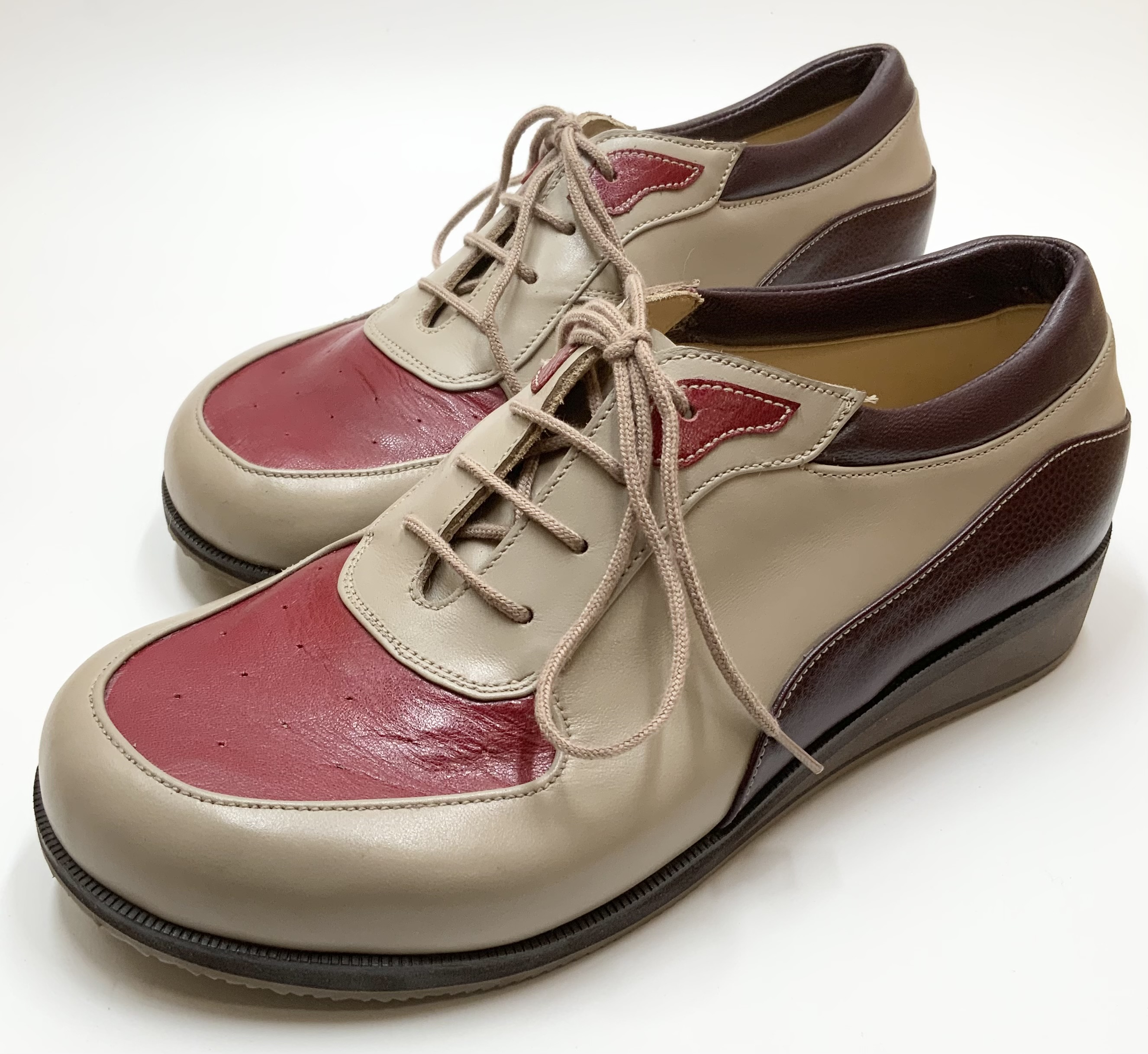 These cute little ‘U Front’ casuals were commissioned to combine different upper colours. Crafted from smooth and silky 'warm beige' Italian veal, hand punched fine Red glacé kid vamp panels, and burgundy rolled grain elongated heel counters. Delicately accented with contrasting top lace panel details and subtle colour contrasts within the layered wedge heels and finished with a caramel everyday sole. Wedge-shaped soles and heels provide essential strength and support to the mid-foot, enhancing the wearer's sense of stability and security. The combination of the uppers and soles provides a retro style that is versatile, practical and comfortable. The shapes and patterning are suitable for various foot conditions and the offer of multiple colour combinations and textures is endless.