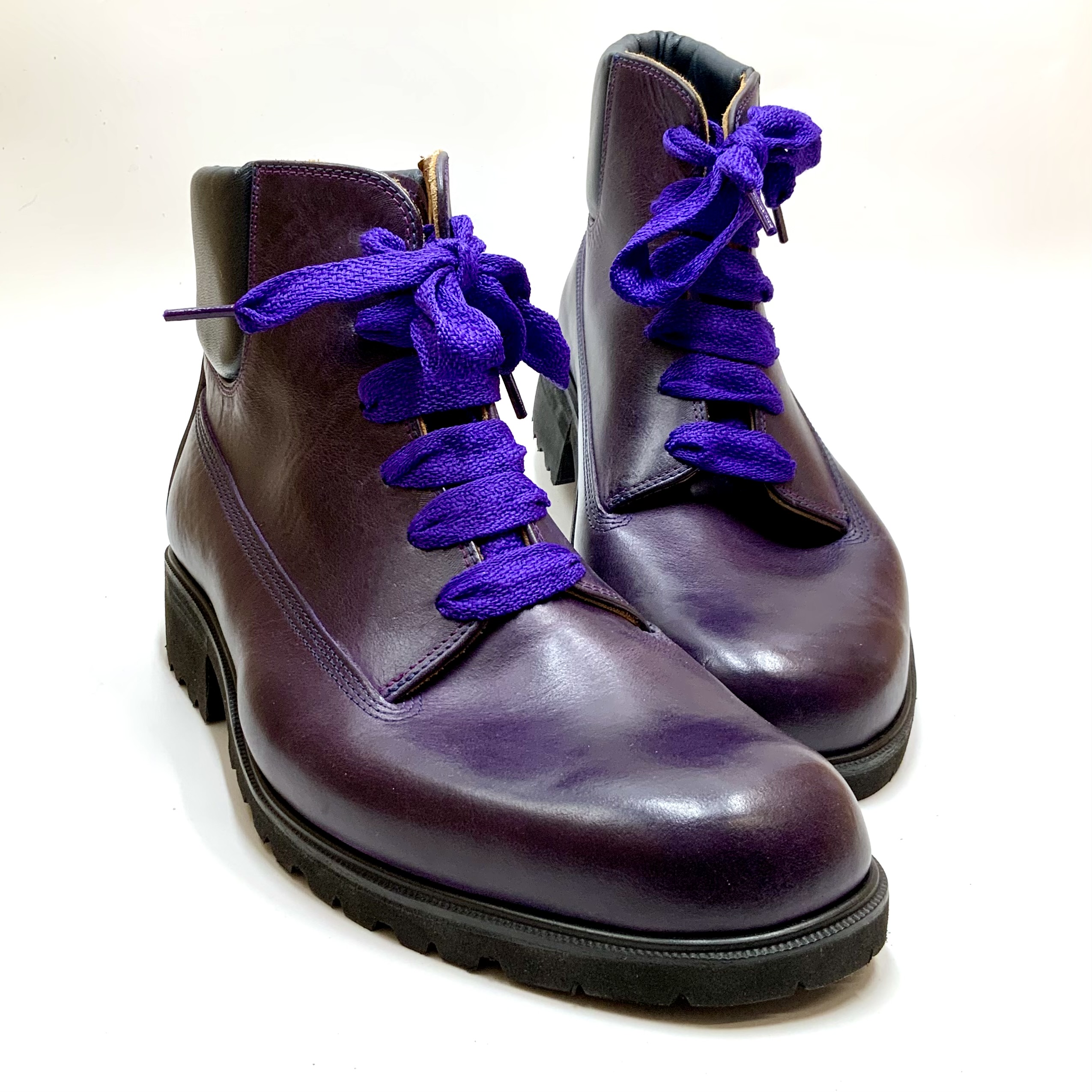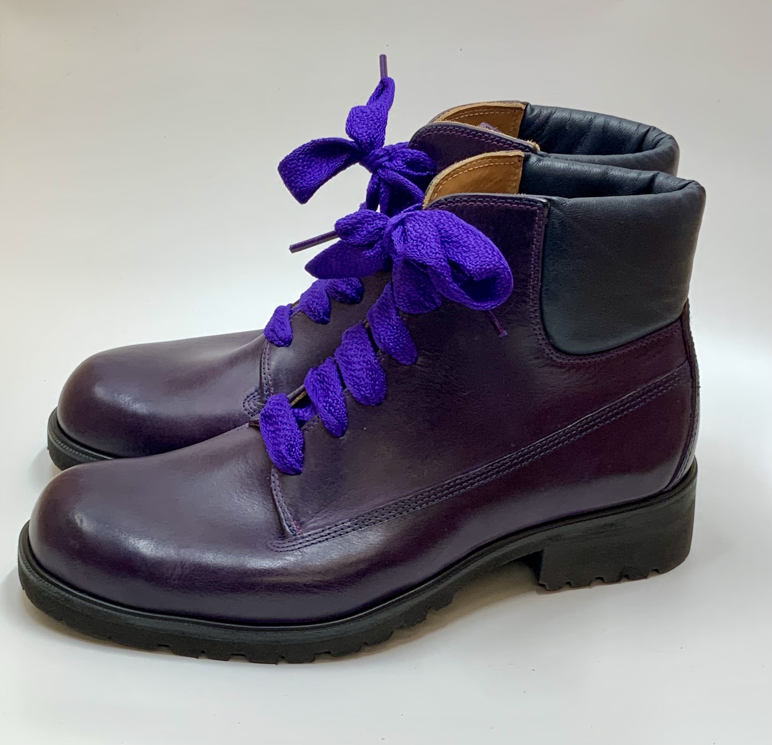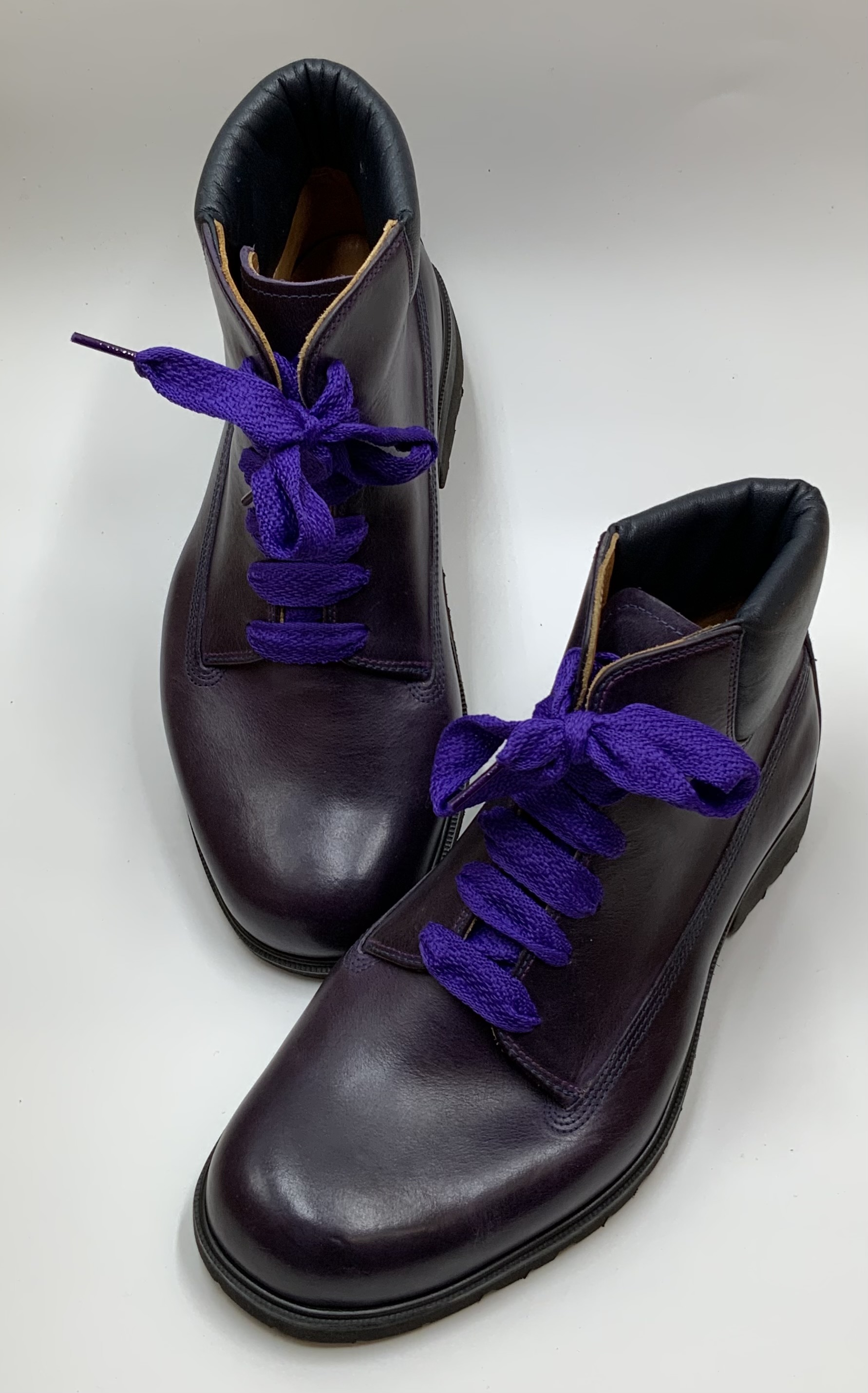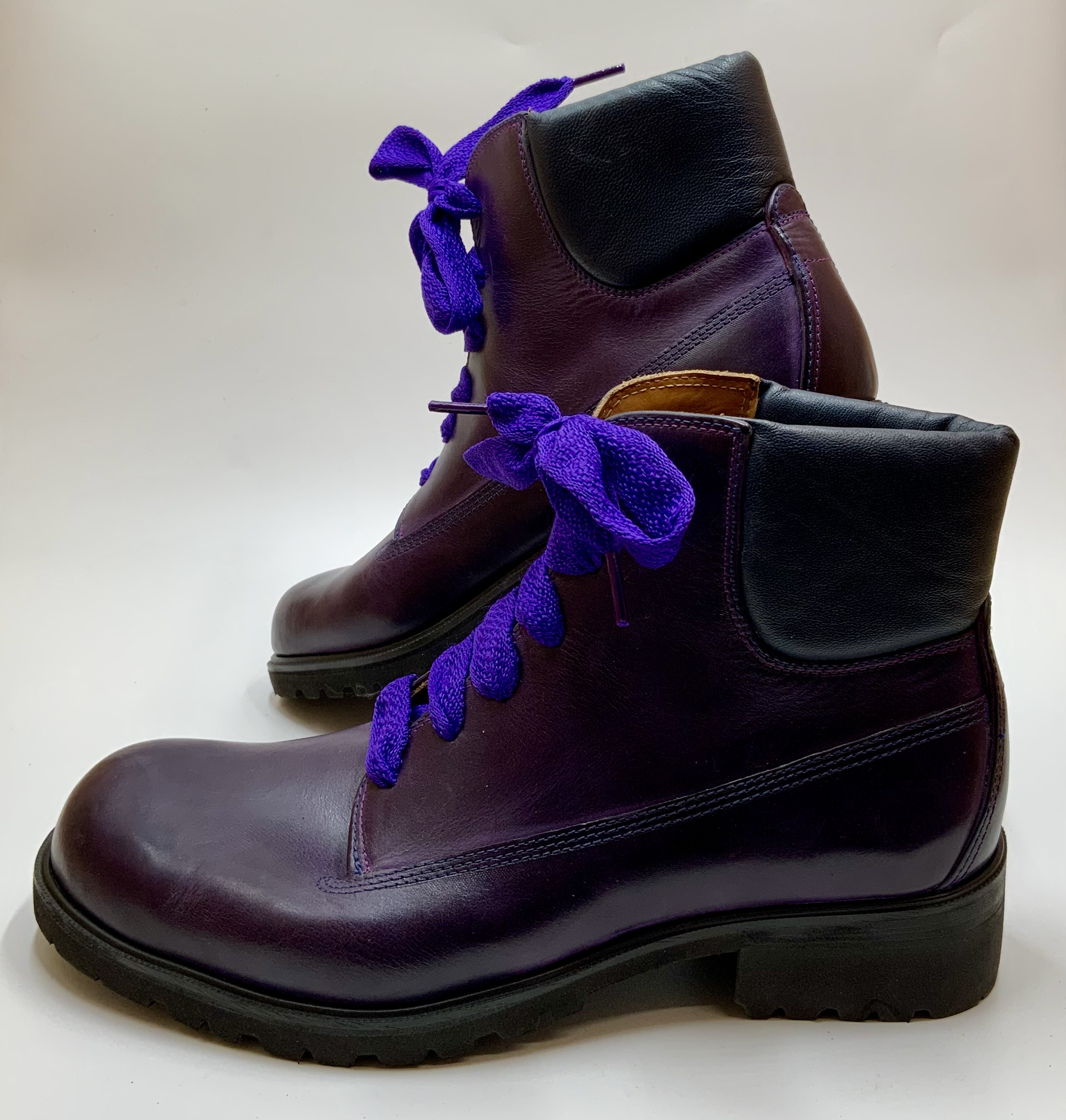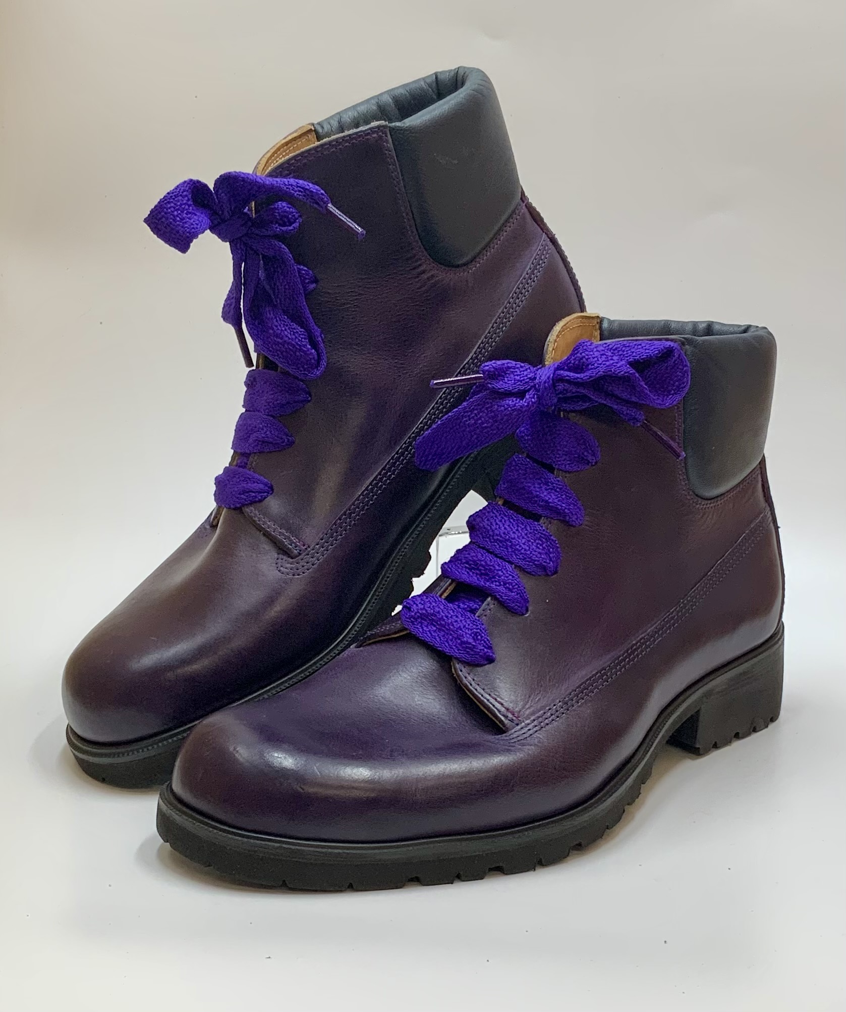 These particular durable boots are designed for extensive outdoor walking and activities. The uppers are crafted from a waxy Deep Purple leather known as Country Cow, providing a firm yet supple hold around the foot. They feature a deep, soft 'lamb' cushion collar that encircles the ankles for added softness, protection, and security. The soles and heels are constructed with Vibram Vi-Lite soles, which are lightweight and include deep cleats and broad heels to enhance comfort, balance, and gait. This exceptional style of boot is suitable for street, country, hill, and mountain walking.