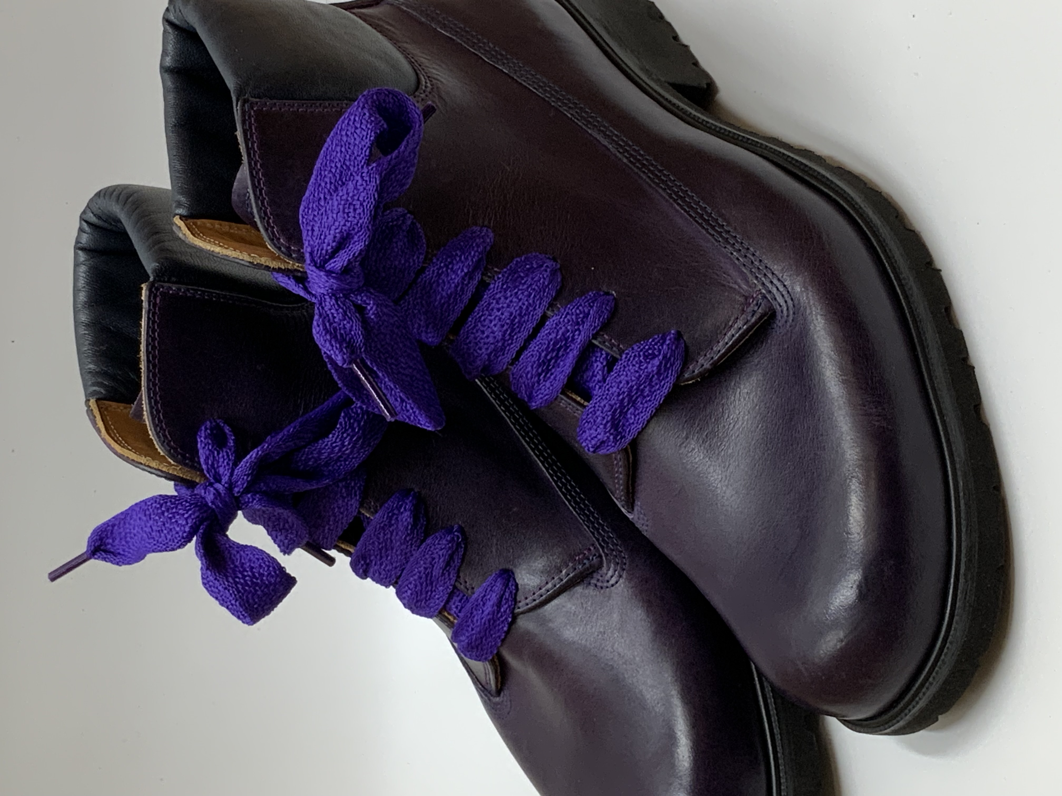 These purple boots are designed for splay feet, which have a wide forefoot and narrow heel due to a collapsed transverse arch. This condition can cause pain, affect gait, and lead to issues like osteoarthritis and bunions. A care plan to treat osteoarthritis, bunions and splay foot would include secure mid-foot