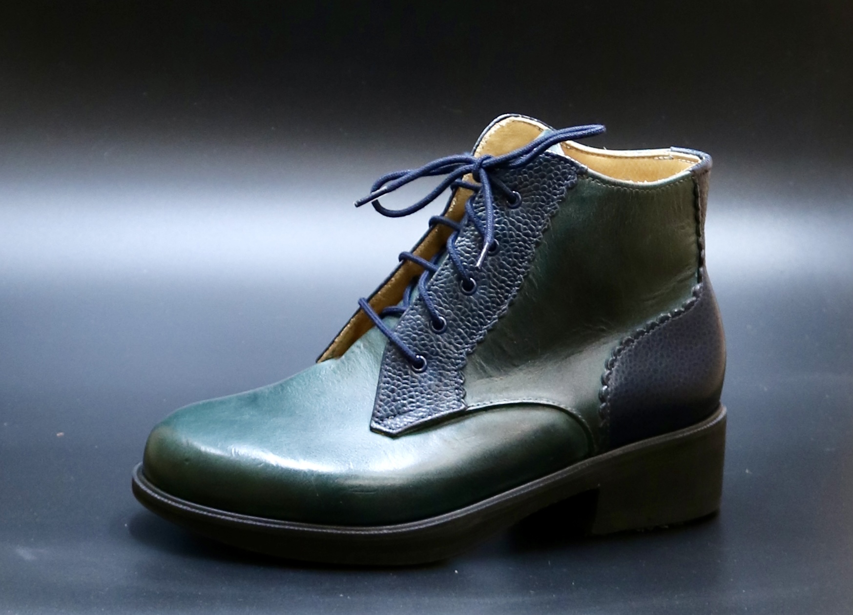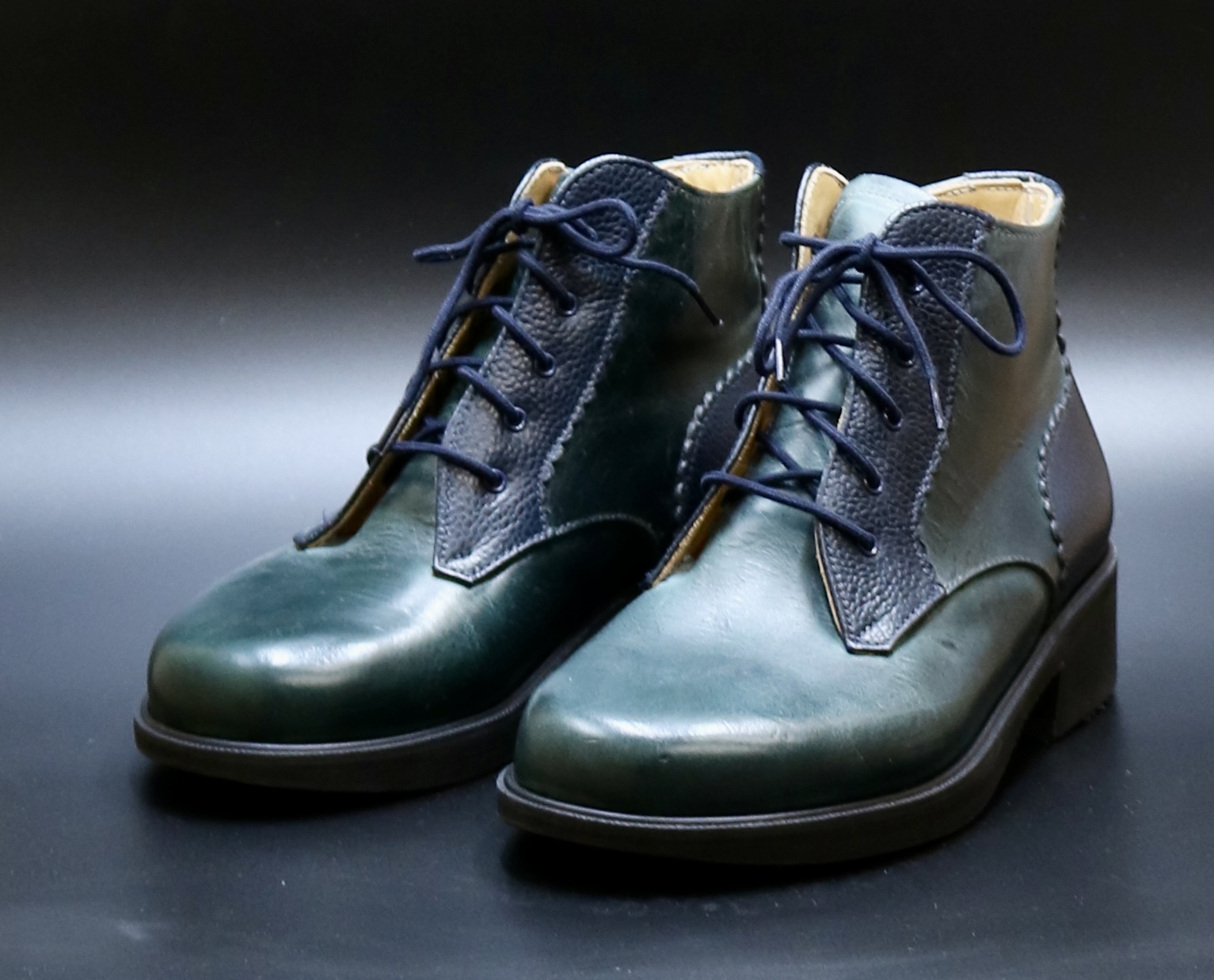 The warm combination of Blue and green in these boots mix perfectly to create a sense the beautiful ocean colour, not quite blue but not quite green – but perfectly in between. Tasteful with individuality, perfect if your thinking and looking for something a little different from the typical monochrome boot. Crafted from rich forest green with a subtle sheen and paired with textured Navy grain lace panels and back counters adding character to the design. Showcasing a lace up ankle boot silhouette with a modern yet slightly vintage aesthetic. These boots offer a striking contrast that catches the eye while remaining versatile enough for everyday wear. Emphasising the craftsmanship they are completed with soles and heels that have a durable and sturdy structure suitable for many occasions.