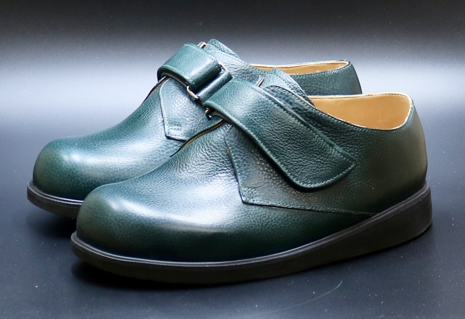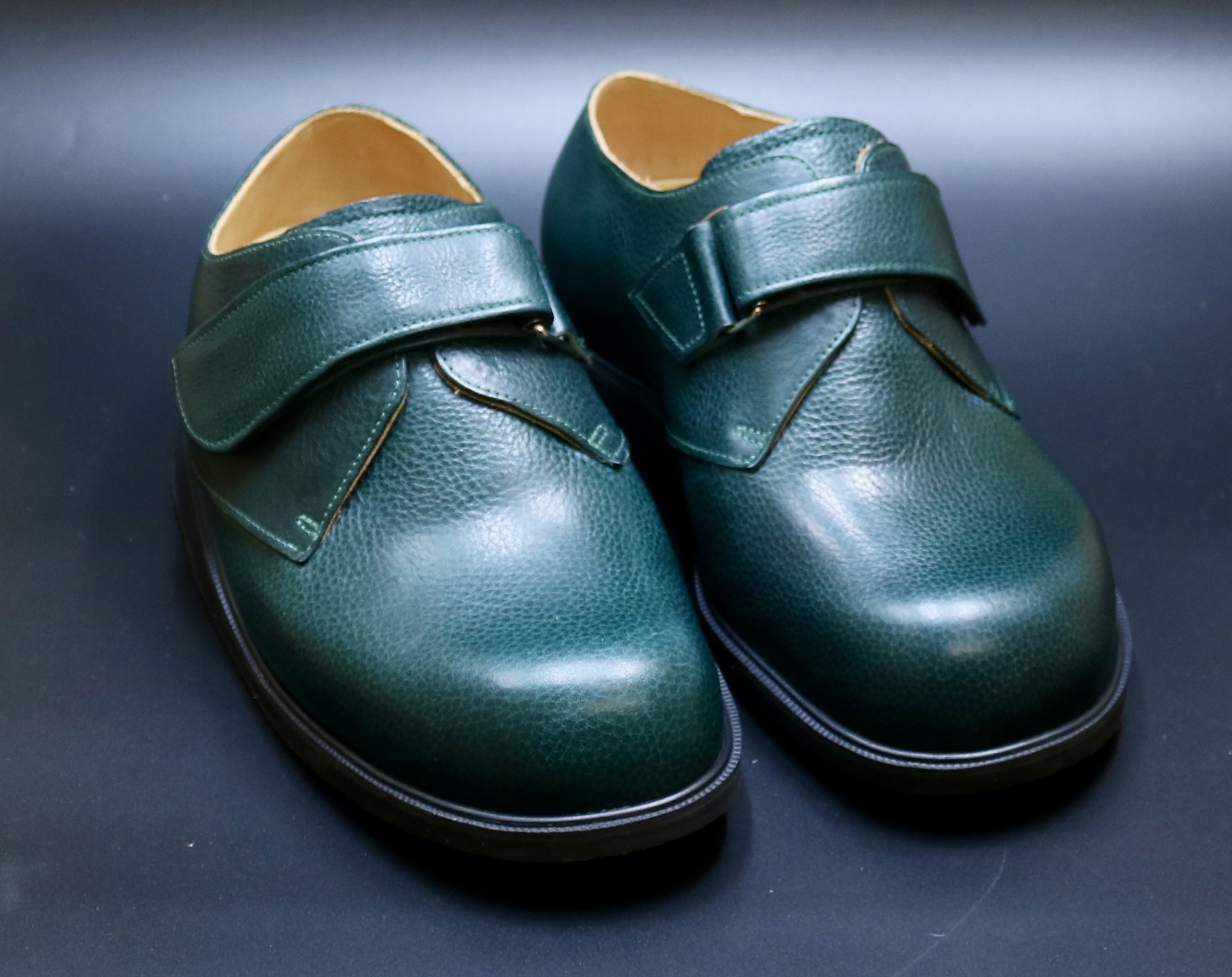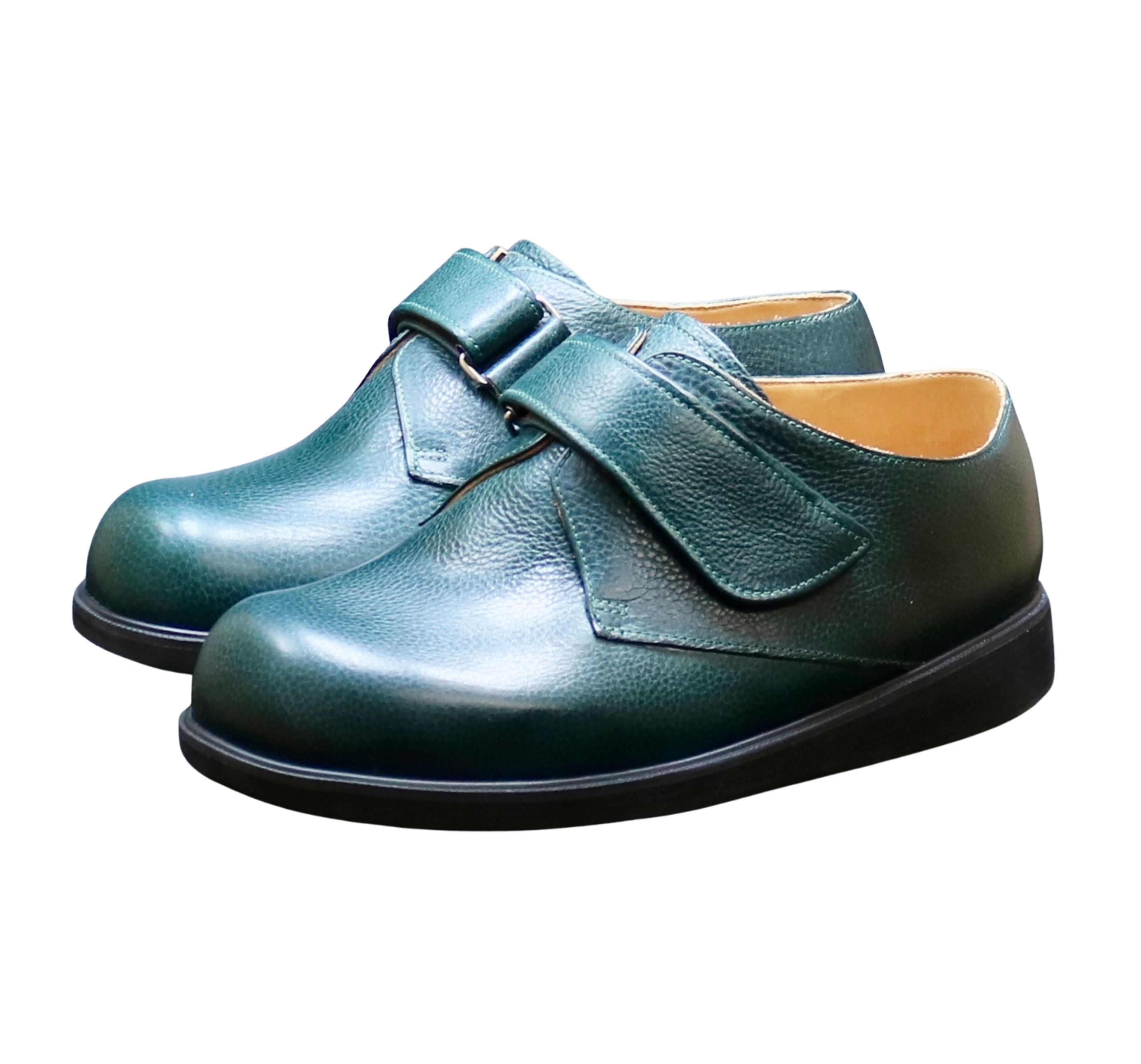 pair of dark green leather casual shoes features wide hook and loop Velcro
